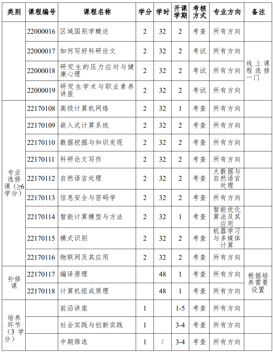 学位基础课包括《论文写作与学术规范》( 1 学分)、《算法设计与分析》(3 学分)以及《高级软件工程》(3 学分)。