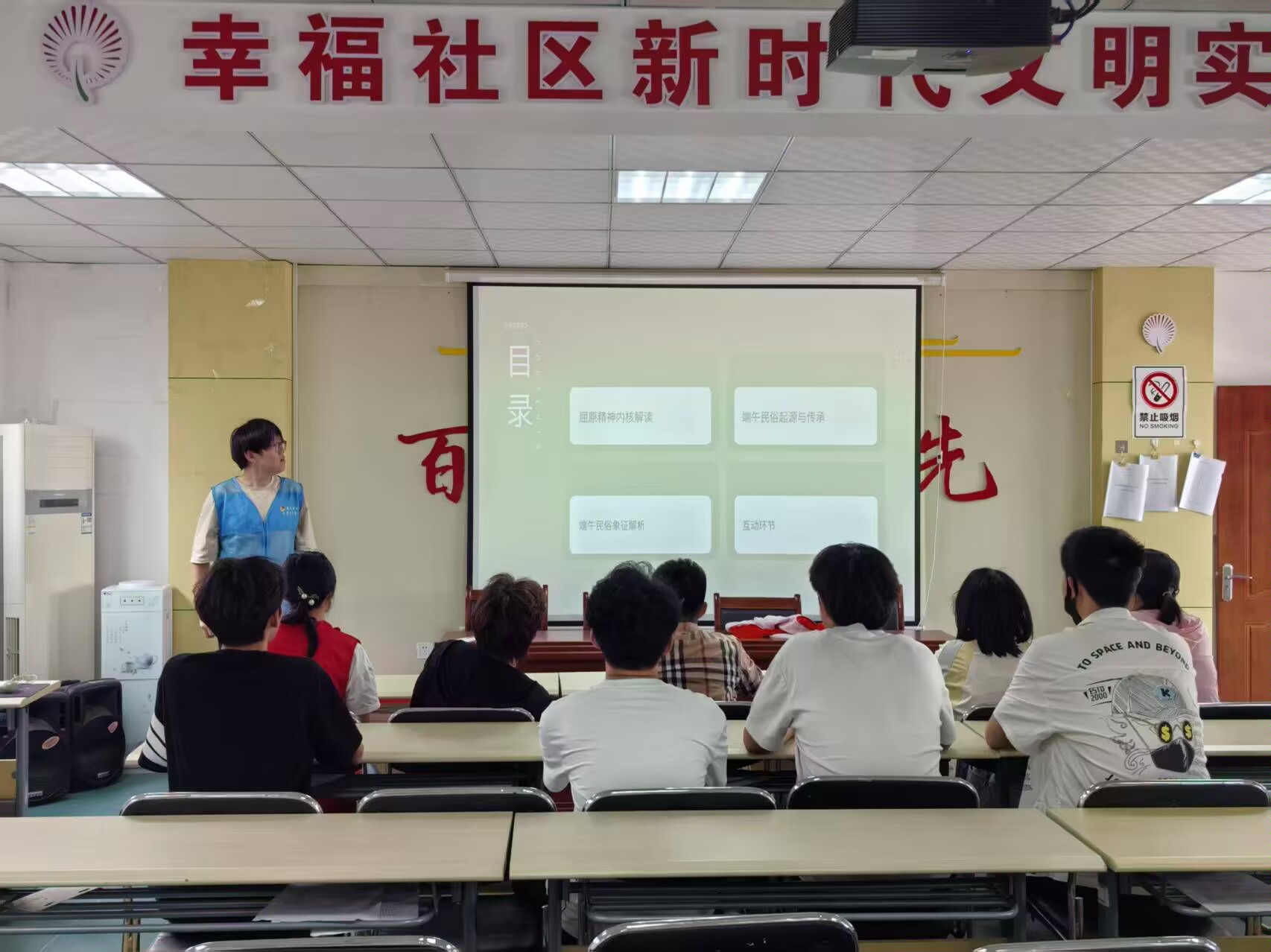 活动伊始,志愿者们带着精心准备的资料,为社区居民讲述屈原故事。从“路漫漫其修远兮,吾将上下而求索”的执着,到爱国忧民、坚守理想的一生,用生动语言与详实史料,解读屈子精神里爱国、求索、担当的深刻内涵。结合新时代背景,志愿者进一步阐释:在拥军、助学、扶孤、敬老、助残等社会公益场景中,无数人以行动践行“心怀家国、无私奉献”,让屈子精神实现当代传承与延伸。随后,志愿者分享当代践行担当的案例,勾勒新时代“精神传承图卷”:医务工作者定期走访失能、失独、特困残疾家庭,送医送药传递关怀;社会各界为留守儿童策划春日之旅,助贫困青少年家庭“爱心圆梦”等桩桩事例,让屈子精神具象化,照见当代担当模样。活动尾声,居民们交流感悟,志愿者与他们一起合影留念,为今天的活动画下一个圆满的句号 。