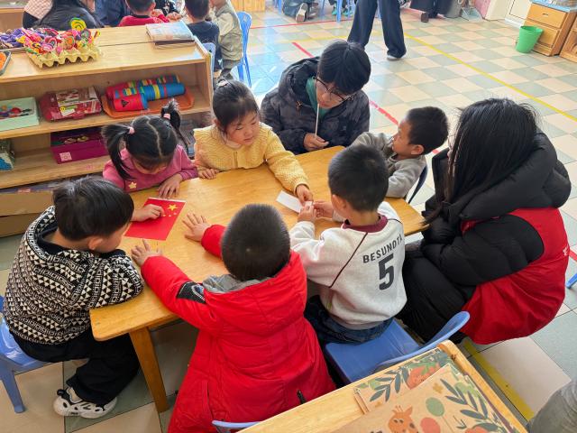 活动伊始,志愿者们结合幼儿认知特点,借助生动的PPT课件,用童趣化的语言带领孩子们认识国旗、党旗、团旗等。志愿者们还通过一个个生动鲜活的红色故事,引出每面旗帜的由来,将抽象的红色文化知识转化为孩子们能理解的趣味内容,让孩子们在聆听中感受旗帜的神圣与庄严。在动手实践环节,志愿者鼓励小朋友们共同完成国旗制作,孩子们一边认真观察步骤,一边主动交流想法、提出问题,志愿者则耐心陪伴,引导大家协作思考,一起用贴纸装饰出富有创意的国旗作品。活动结束后,志愿者们纷纷表示,此次活动让他们对红色文化的精神内涵有了更真切的体悟,也从与孩子们的互动和现场协调中,积累了宝贵的沟通经验与服务技巧,进一步坚定了继续投身志愿服务的信心与热忱。