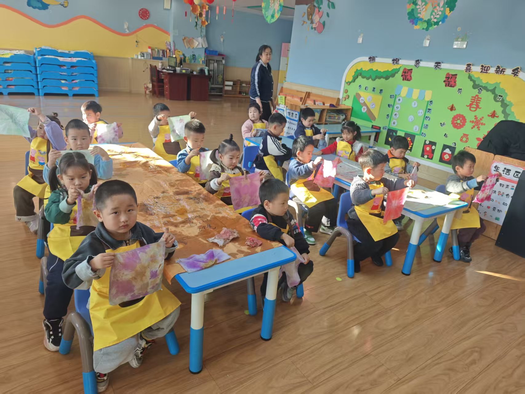 活动前期,团支部周密筹备、细致部署。通过班级动员会招募志愿者组建专业教学小组,结合幼儿认知特点与动手能力,简化扎染创作流程,精心编制图文并茂的教学图示与安全操作规范。同时,团队积极对接幼儿园,协调落实教学场地,筹备纯棉方巾、环保安全染料等实操材料,从流程设计、物资准备到安全保障全方位发力,为活动有序开展筑牢坚实基础。课堂上,团队成员以趣味非遗故事、精美扎染成品等方式点燃幼儿兴趣,分步演示折叠、捆扎、浸染等基础技法,耐心指导孩子们分组实践。孩子们大胆探索、创意发挥,创作出一件件色彩灵动、图案别致的扎染作品,在亲手实践中沉浸式感受传统工艺的独特魅力。课后,活动延伸至家庭场景,开启“文化反哺”新形式。幼儿化身“小小非遗老师”,将课堂所学扎染技艺分享给家长,携手家人完成亲子扎染作品,在协作创作中增进情感交流,让传统文化扎根家庭生活。活动以创新互动模式搭建文化传承桥梁,让千年扎染技艺在亲子陪伴中焕发新生,构建起传统文化家园共育的生动场景。