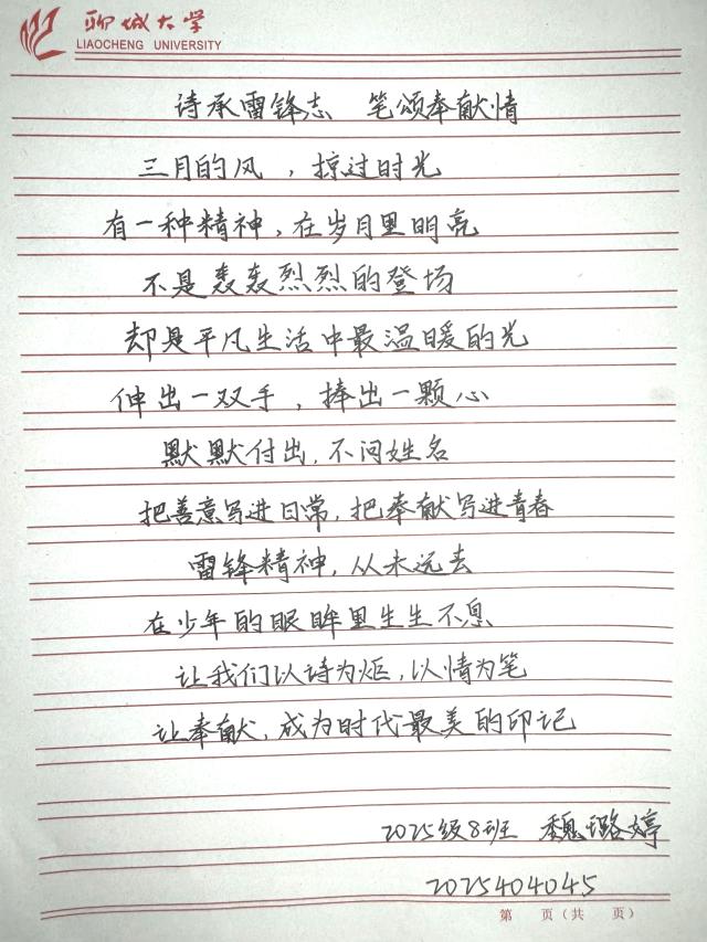 本次活动以古体诗或现代诗为载体,鼓励同学们用笔墨抒发对雷锋精神的理解与感悟,用诗意笔触勾勒出新时代青年的奉献模样。活动征集了来自各年级的原创作品,每一篇真挚的作品都凝聚着同学们对雷锋精神的深刻思考,展现了青年学子积极向上、崇德向善的精神风貌。接下来,就让我们一同品读部分优秀作品,感受文字里的温暖与力量!