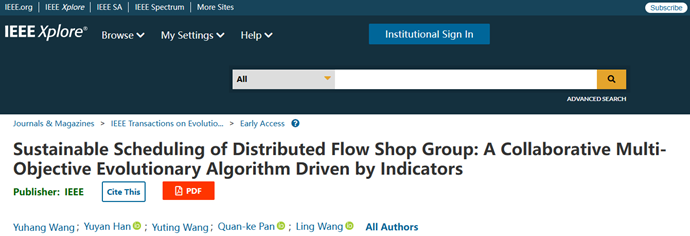 近日,计算机学院韩玉艳老师团队在进化计算领域顶级学术期刊《IEEE Transactions on Evolutionary Computation》(中科院1区Top,影响因子为14.3)上发表研究论文“Sustainable Scheduling of Distributed Flow Shop Group: A Collaborative Multi-objective Evolutionary Algorithm Driven by Indicators”(DOI: 10.1109/TEVC.2023.3339558.)。论文第一作者为硕士研究生王宇航,韩玉艳副教授、王玉亭副教授为通讯作者,上海大学潘全科教授和清华大学王凌教授参与并指导该研究。聊城大学计算机学院为论文第一署名单位。