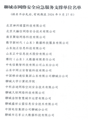 历经相关单位自主申报、材料审核、审批等环节严格筛选, 近日,聊城市委网信办发布了《聊城市网络安全应急服务支撑单位名单》,最终共有17家具备强大技术实力和社会责任感的网络安全机构脱颖而出,聊城大学计算机学院位列其中。