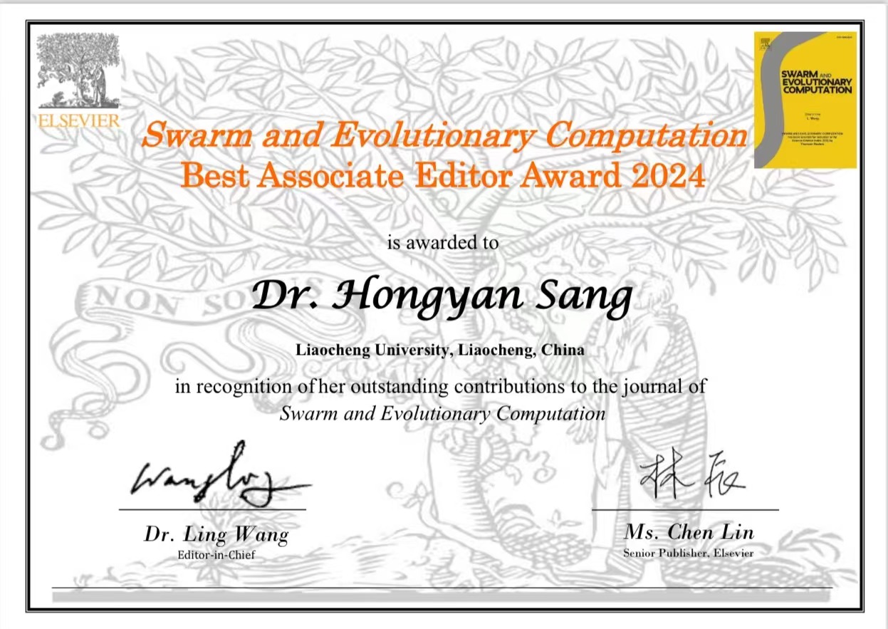 近日,我院桑红燕教授获中科院一区期刊《群体与进化计算》(《Swarm and Evolutionary Computation》,SWEVO)2024年度最佳副主编奖(Best Associate Editor Award) ,以表彰其对期刊发展做出的杰出学术与服务贡献。 据悉,爱思唯尔(Elsevier)出版社根据稿件处理数量、质量、效率等进行综合评价,从SWEVO期刊66名副主编中遴选5位授奖,这是该期刊首次评选此奖项。荣获此奖,不仅表明桑红燕教授在群体智能领域具有重要影响力,也有助于提升聊城大学在相关领域的影响力。 《群体与进化计算》(《Swarm and Evolutionary Computation》)是爱思唯尔(Elsevier)旗下期刊,是群体智能与进化计算领域的权威期刊,收录面向复杂系统的智能优化理论、方法及应用方向的相关研究成果。该期刊的最新SCI影响因子为8.2,中科院一区期刊,JCR分区Q1。