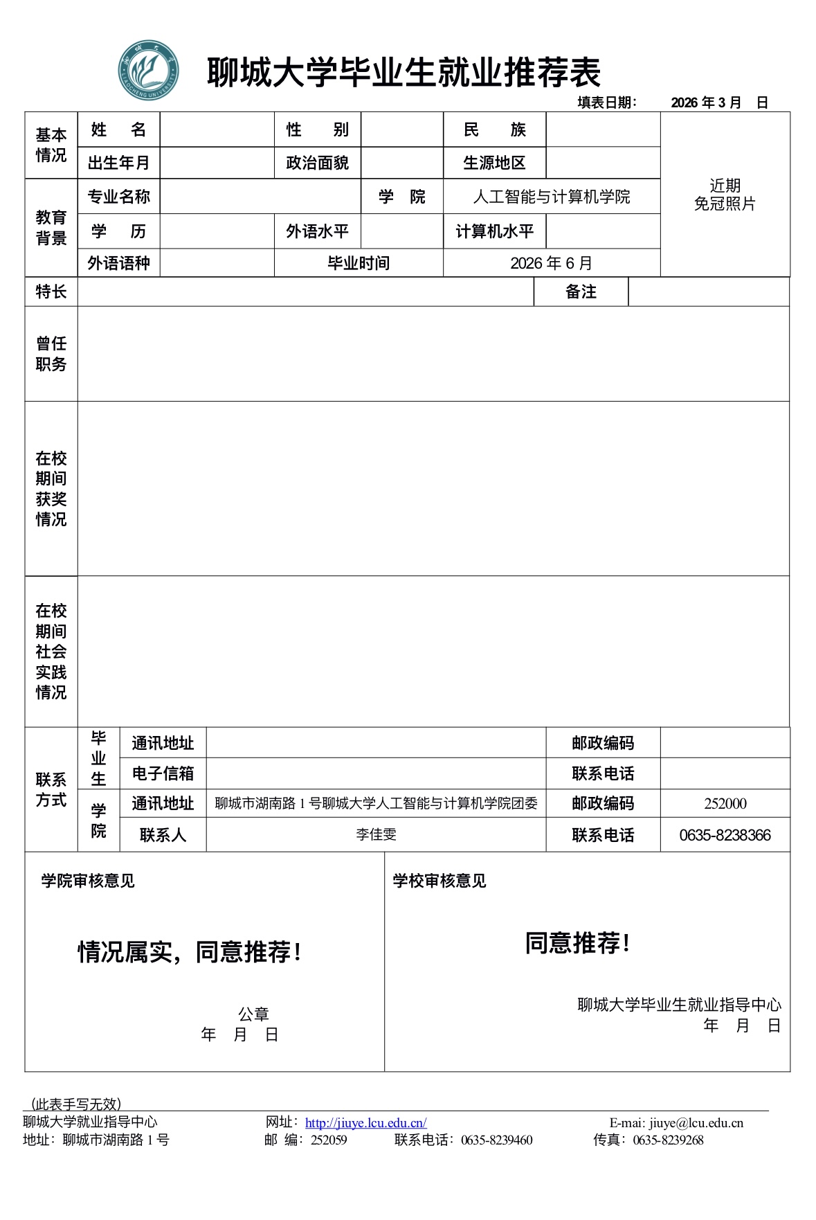 聊城大学毕业生就业推荐表